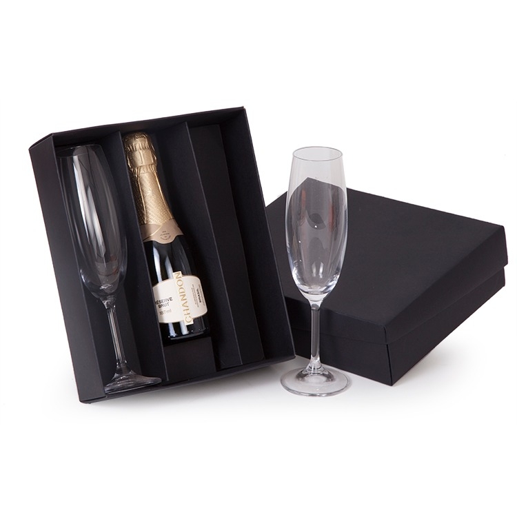 1 Espumante Chandon Reserve 187ml 2 Taças de cristal 200ml 1 Caixa e berço corte e vinco em papel cartão preto fundo 400gr tampa 200gr 24x19.5x7cm / peso 0.950g BABY2