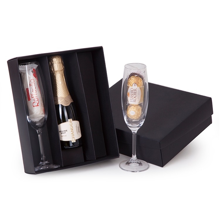 1 Espumante Chandon Reserve 187ml 2 Taças de cristal 200ml 3 unid Bombons Ferrero Rocher 30g 3 unid Raffaello 30g 1 Caixa e divisoria corte e vinco em papel cartão 300gr tampa 225gr 24x19.5x7cm / peso 0.950g F169/169B/49/246 Personalizamos com sua logomarca,consulte ! chandonbombom chandonferrero