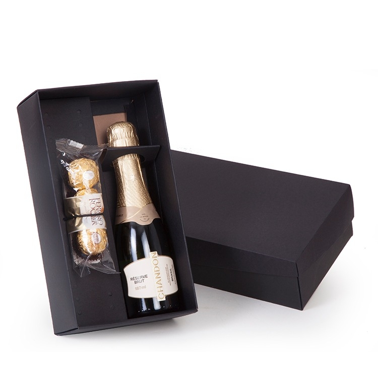 1 Espumante Chandon Reserve 187ml Bombom FERRERO ROCHER 37,5g 3 unid. 1 Caixa e berço corte e vinco em papel cartão fundo e beço 400gr tampa 200gr 23.5x13x7cm / peso 0.650g chandonbombom chandonferrero