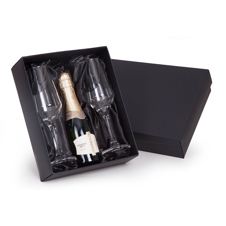 1 Espumante Chandon Reserve 187ml 2 Taças de vidro 1 Caixa corte e vinco em papel cartão preto e fundo 400gr tampa 200gr Berço com cetim preto 24x19.5x7cm / peso 0.990g F169/169B/49/246 BABY2