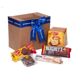 1 Panetone Bauducco 80gr 1 Pão de mel Siareg 40g 1 Cookies Bauducco 60g 1 Torrone montevergine 70gr 1 Hershey`s Mais 100g 1 Maleta corte e vinco em papel cartão Kraft com visor e laço Peso 0.396gr / 21x14x20cm