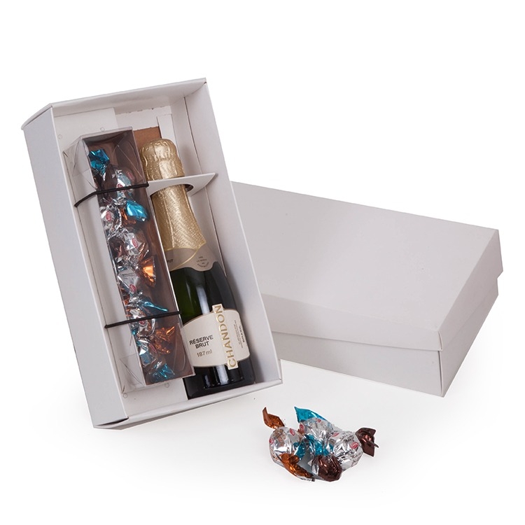 1 Espumante Chandon Reserve 187ml 5 Unid Bombons Witor´s Selection Crispy 1 Caixa e berço corte e vinco kraft ou branco 360/200gr 23.5x13x7cm / peso 0,890gr chandonbombom