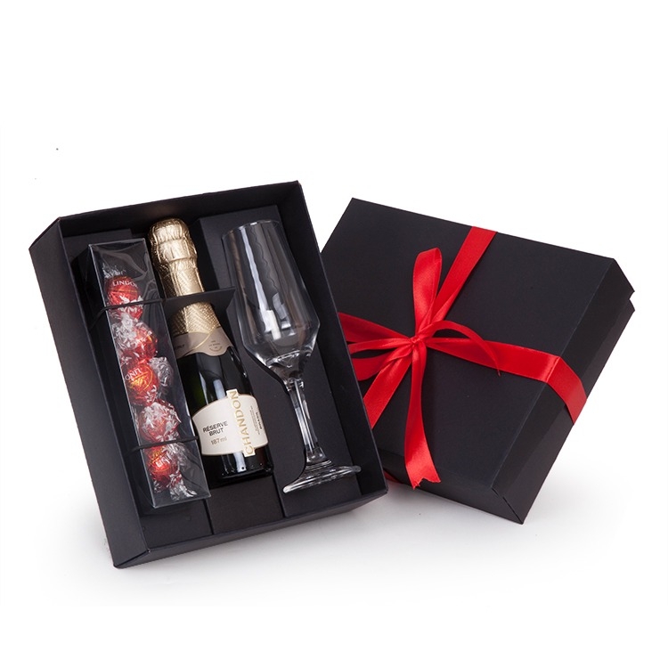 1 Espumante Chandon 187ml 1 Taça de vidro 186ml 5 Unid Lindt 1 Caixa e berço corte e vinco em papel cartão 400gr tampa 200gr com laço 24x19.5x7cm / peso 0.870g chandonlindt