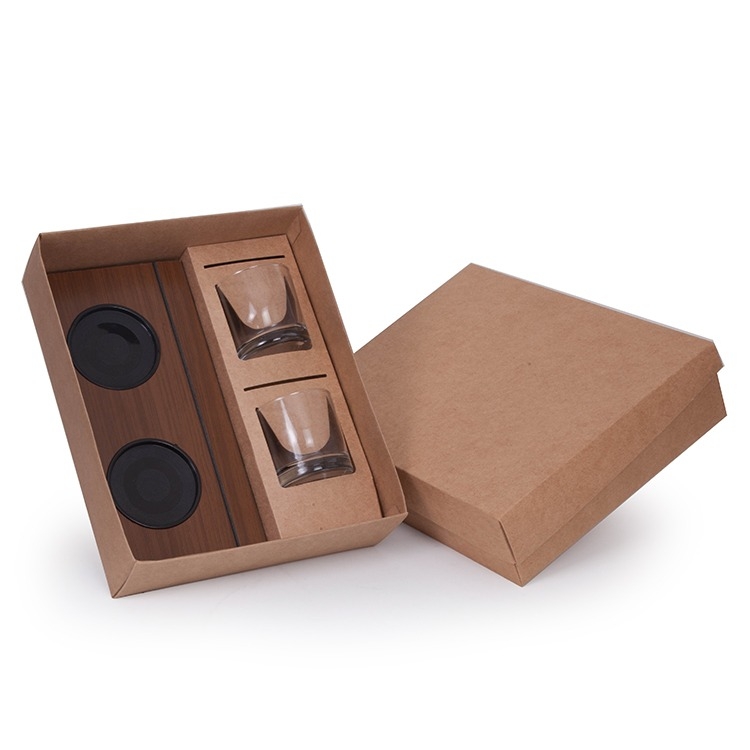 1 Porta copos/taças de sofá (MDF) 2 Copos rocks de vidro 310ml (J255) 1 Caixa corte e vinco em papel cartão kraft e fundo 400gr tampa 180gr 34x28x9cm / peso 1.500kg Personalizamos com sua logomarca, consulte!