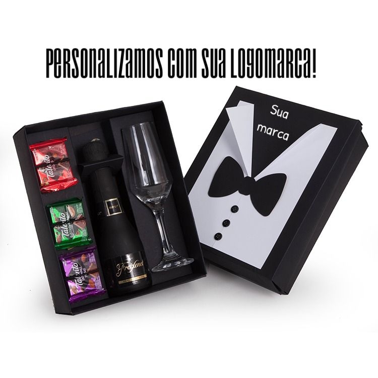 1 Espumante Freixenet Cordon Negro 200ml 3 Chocolates Talento 25gr 1 Taça de vidro 1 Caixa corte e vinco em papel cartão preto e fundo 400gr tampa 200gr 24x19.5x7cm / peso 0.880g