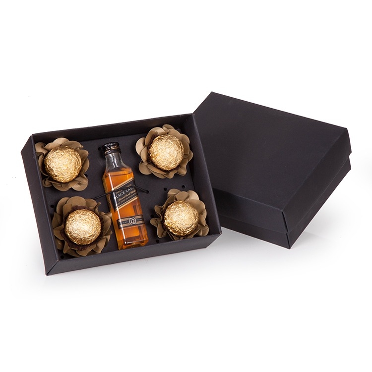 1 Whisky Johnnie Walker Black label 50ml 4 unid Bombom Ferrero Rocher 1 Caixa e berço corte e vinco em papel cartão 17x13x6cm / Peso 0,200gr