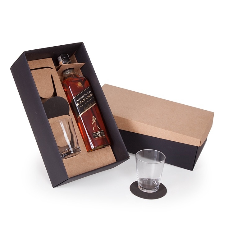 1 Whisky Johnnie Walker Black Label 750ml 2 Copos de vidro old fashioned 216ml 7101 2 Porta copos em E.V.A 1 Pinça em aço inox para gelo 1 Caixa e berço corte e vinco em papel cartão preto e kraft 400gr Peso 1.950g / 34x19x10cm