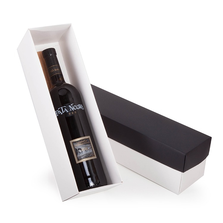 1 Caixa corte e vinco em papel cartão branco 360gr tampa preta 400gr 34x9.5x10cm Obs: ideal para garrafas tradicionais de 750ml (foto ilustrativa) não acompanha garrafa e palha cx1gfavh