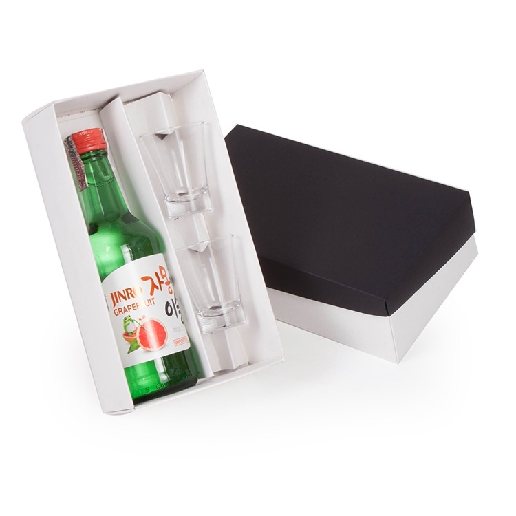 1 Bebida Coreana Soju Jinro Toranja Grapefruit Hitejinro Importada 360ml 2 Copos de vidro dose 60ml 1 Caixa e berço corte e vinco em papel cartão preto e branco Peso 900g / 23.5x13x7cm