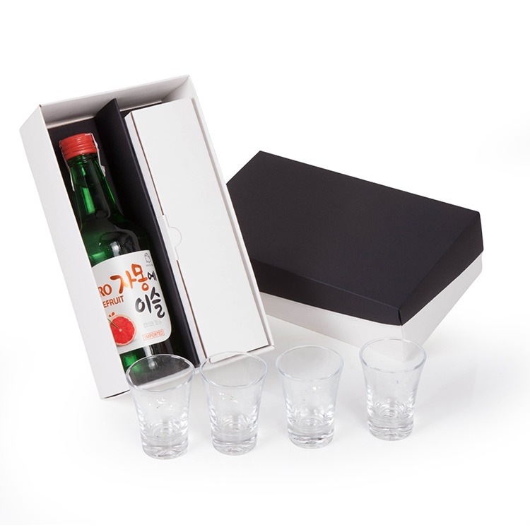 1 Bebida Coreana Soju Jinro Toranja Grapefruit Hitejinro Importada 360ml 4 Copos de vidro dose 60ml 1 Caixa e berço corte e vinco em papel cartão preto e branco Peso 1.110kg / 23.5x13x7cm