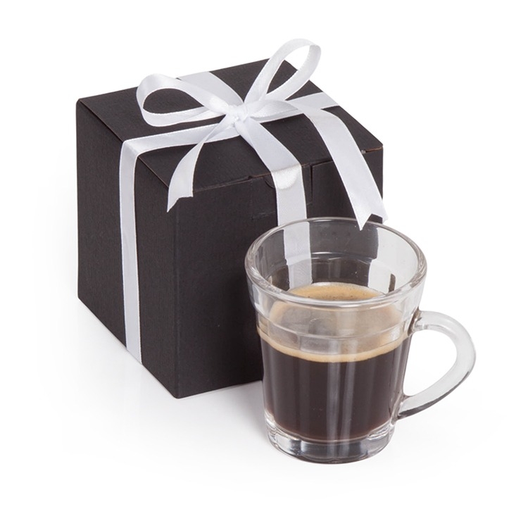 1 Xicara de vidro para café 90ml 1 Caixa corte e vinco em papel cartão preto 400gr 7.5x7.5x7.5cm Peso 0,150g F171A