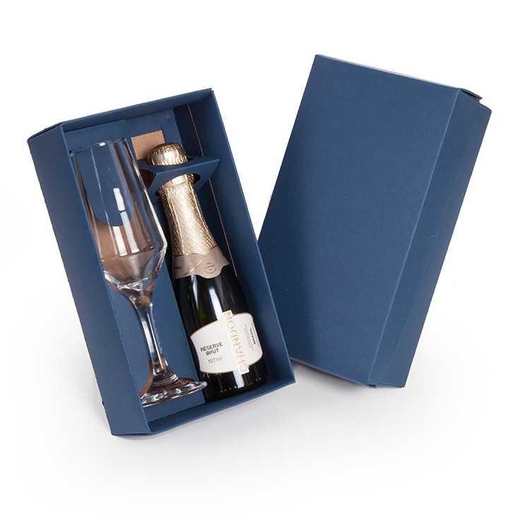 1 Caixa e berço corte e vinco em papel cartão azul porto seguro 400gr e tampa 200gr 23.5x13x7cm caixa desenvolvida para espumante de 187ml Berço desenvolvido para taça espumante altura 20 boca 4 pé 6,2 modelo J708 Nadir Figueiredo (foto ilustrativa) não acompanha bebida e taça F168/168B/50/246 baby01SE