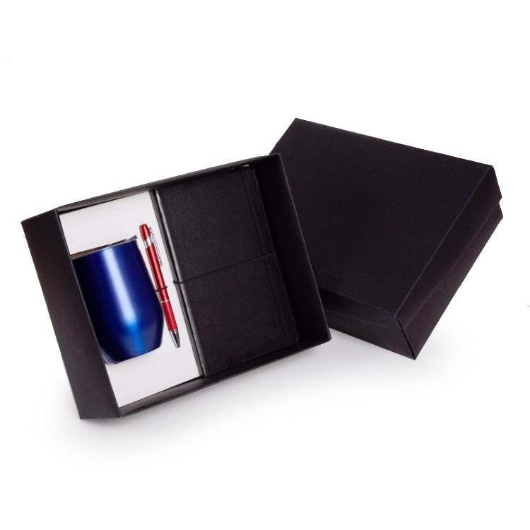1 Caixa corte e vinco em papel cartão preto fundo 400gr e berço branco 360g tampa preta 400gr 28x22x10cm (foto ilustrativa) não acompanha caneta , caderneta 14x21cm e copo cuia.
