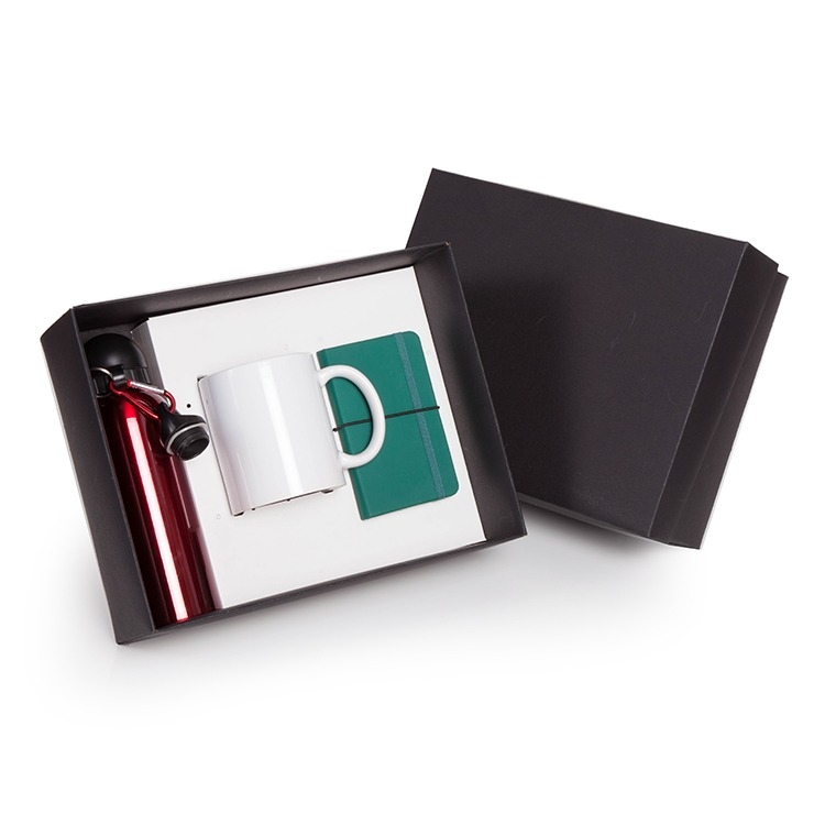 Caixa corte e vinco em papel cartão preto fundo 400gr e berço branco 360g tampa preta 400g 28x22x10cm (foto ilustrativa) não acompanha caneta, caderno e garrafa.