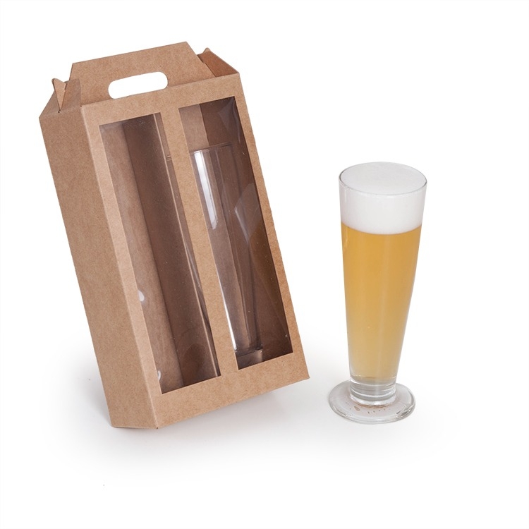 1 Maleta corte e vinco em papel cartão kraft 400gr com visor 14x7x26cm desenvolvida para 2 Tulipas de vidro para cerveja 7715 Nadir 300ml (foto ilustrativa) só embalagem não acompanha os dois copos.