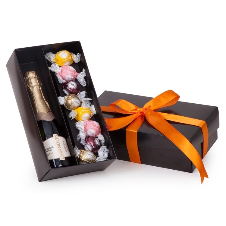 Caixa corte e vinco em papel cartão preto fundo e berço 400gr tampa 200gr (foto ilustrativa) não acompanha bebida, laço e bombons Berço desenvolvido para espumante baby de 187ml 23.5x13x7cm