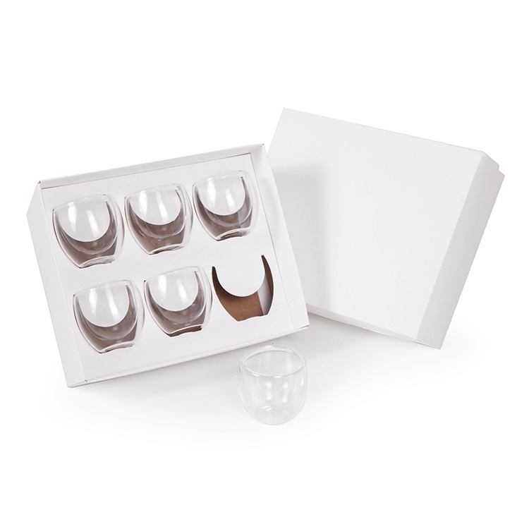 6 Copos de vidro parede dupla Borossilicato 80ml 1 Caixa e berço corte e vinco em papel cartão branco 360g 24x19.5x8.5cm Personalizamos com sua logomarca, consulte! CPBorossilicato