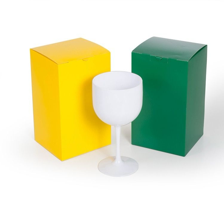 1 Taça de acrilico branco para gin 580ml 1 Caixa em papel cartão corte e vinco na cor verde ou amarela 200gr Personalizamos com sua logomarca, consulte! 12x13x22.5cm / Peso 0150gr F98