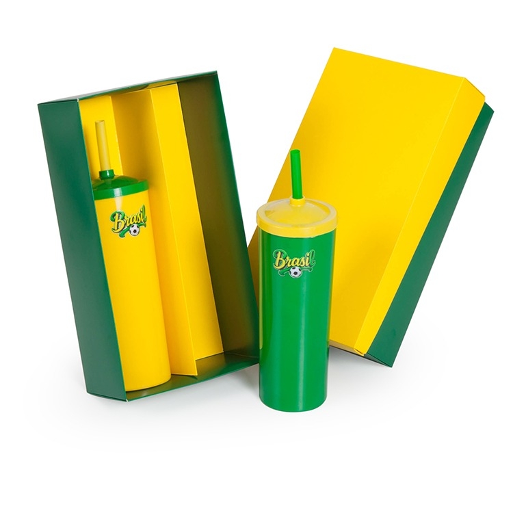 2 Copos tubo em acrilico com tampa e canudo 1 Caixa e divisória corte e vinco em papel cartão verde e amarelo 200gr Personalizamos com sua logomarca, consulte! 23.5x13x7cm / Peso 0.160g