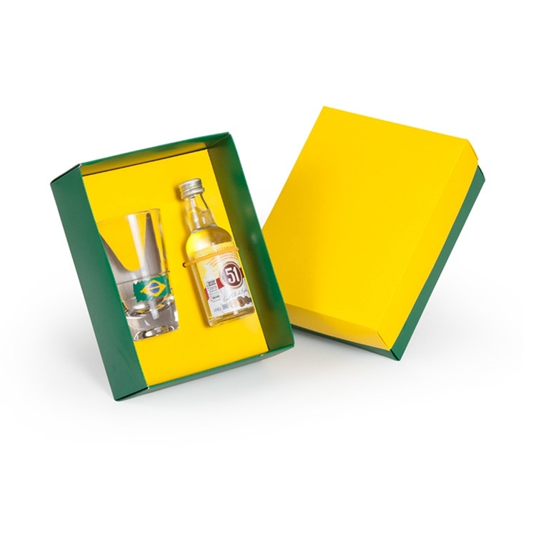 1 Cachaça 51 Pirassununga 50ml 1 Copo de vidro caninha dose 100ml (3033) 1 Caixa e berço corte e vinco em papel cartão 200gr 17x13x6cm / Peso 0,460gr Personalizamos com sua logomarca, consulte Cx 196 - B404