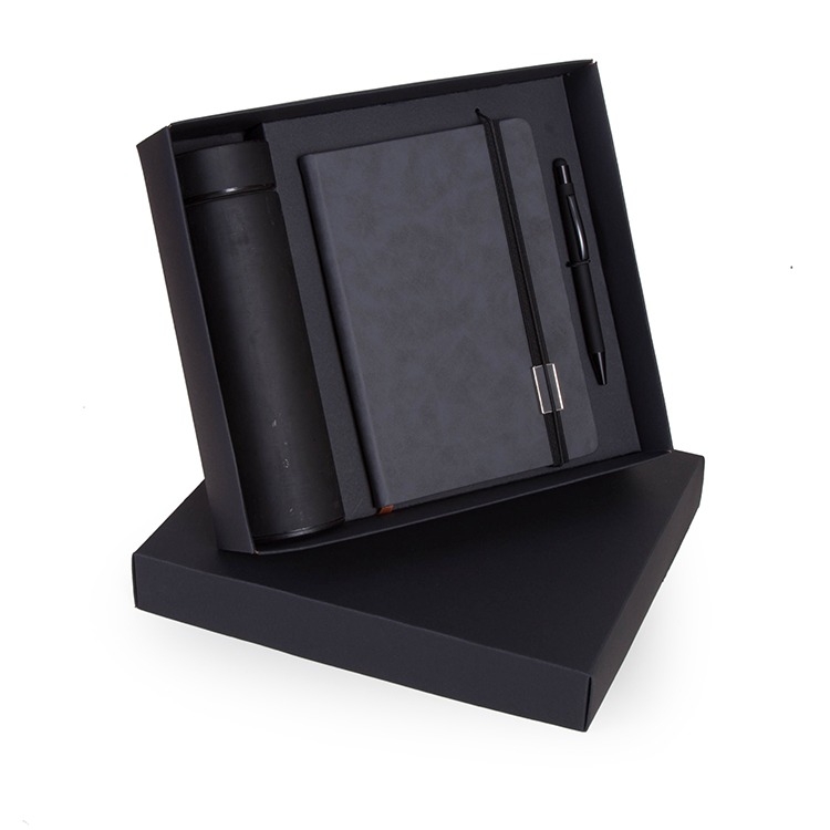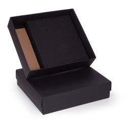 Caixa corte e vinco em papel cartão preto fundo e berço 400gr tampa 200gr 27X24X7CM Berço corte e vinco em papel cartão multiuso 19x23.5cm para fixação de peças com elástico, espaço para garrafa 7x23x6.5cm OBS: NÃO ACOMPANHA OS PRODUTOS ENTERNOS E ELASTICO