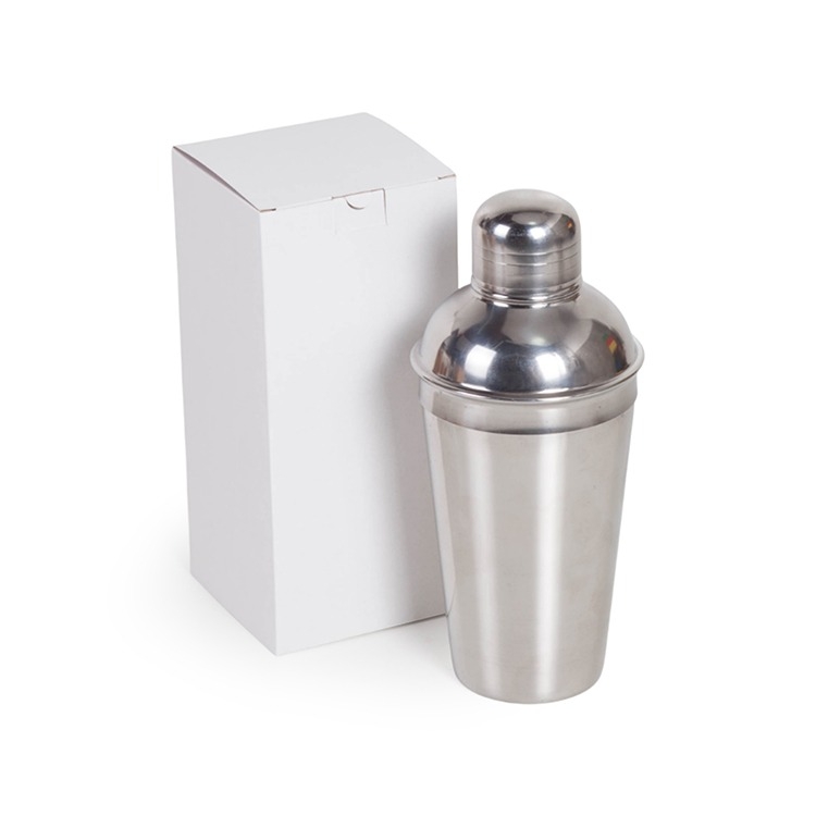 Coqueteleira em aço inox 500ml Caixa corte e vinco sem visor em papel cartão branca 360gr ou kraft 400gr 9.8x9.8x18cm/ peso 0.260gr