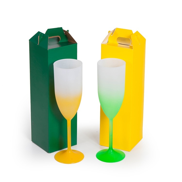 1 Taça em acrilico para champanhe 20cm 210ml 1 Caixa corte e vinco em papel cartão 200gr 26x6x6cm Peso 0.080g Personalizamos com sua logomarca, consulte!