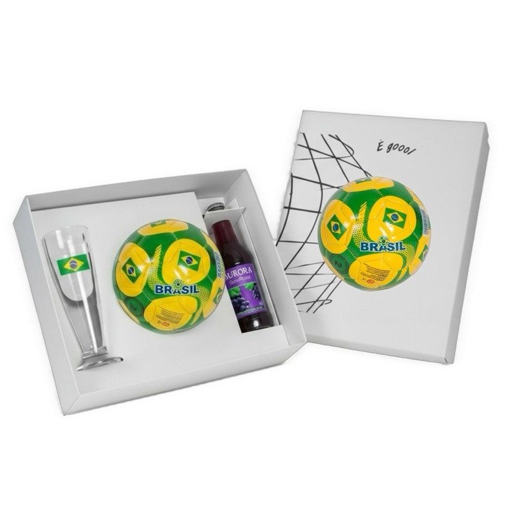 1 Suco de uva integral gaseificado Aurora 275ml 1 Tulipa de vidro 300ml 1 Mini Bola de Futebol Circunferencia : 45-46 cm (foto ilustrativa) 1 Caixa e berço corte e vinco em papel cartão branco 360gr Peso 1.150g / 34x28x9cm B103 F48/9 T177