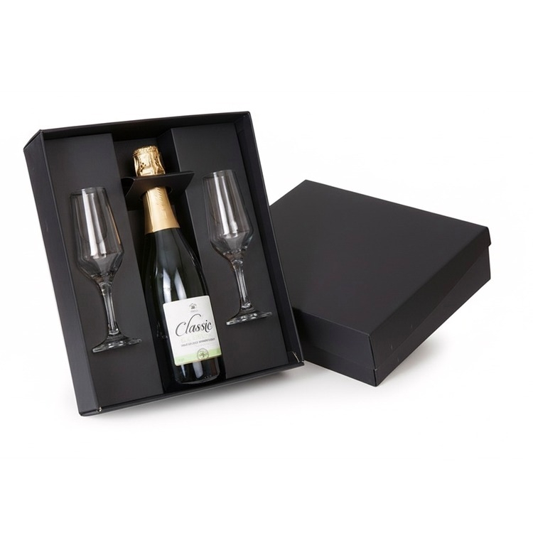 1 Espumante Salton Classic moscatel 750ml 2 Taças de vidro 186ml 1 Caixa e berço corte e vinco em papel cartão preto 400gr 34x28x9cm / Peso 2.330g B51