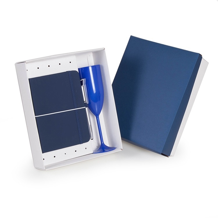 1 Caixa e berço multiuso corte e vinco em papel cartão branco 360g , tampa azul 200gr 24x19.5x7cm (foto ilustrativa) não acompanha moleskine, caneta e taça. cp22se