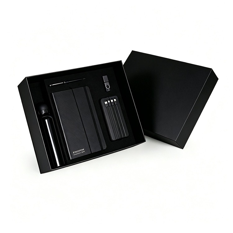 Caixa e berço multiuso corte e vinco em papel cartão preto fundo e berço preto 400gr tampa preta 320gr 34x28x9cm (foto ilustrativa) não acompanha elástico, moleskine , power bank e outros produtos internos (somente caixa e berço) 48/9